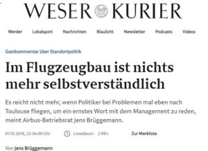 (07.10.2018) Ein halbes Jahr vor der Landtagswahl in Bremen wurde der „richtige“ Umgang der Landesregierung mit dem Airbus-Management in den lokalen Medien thematisiert.